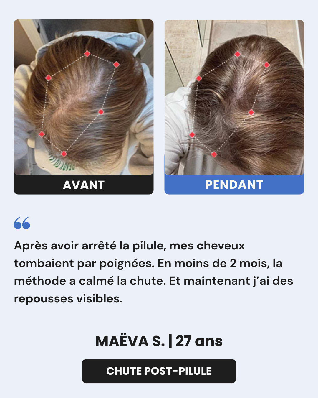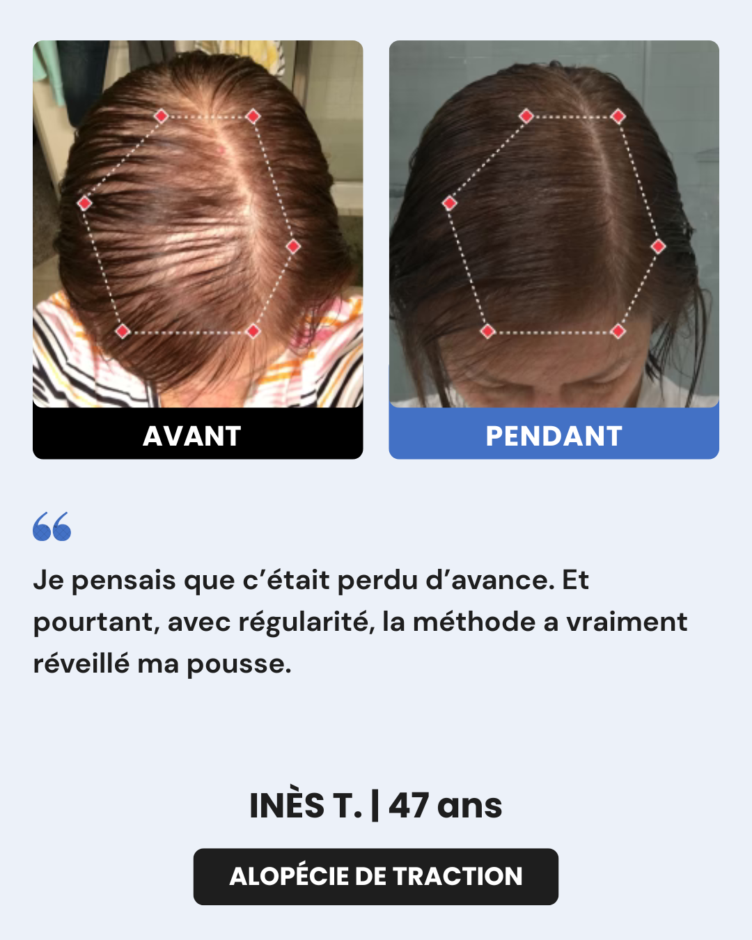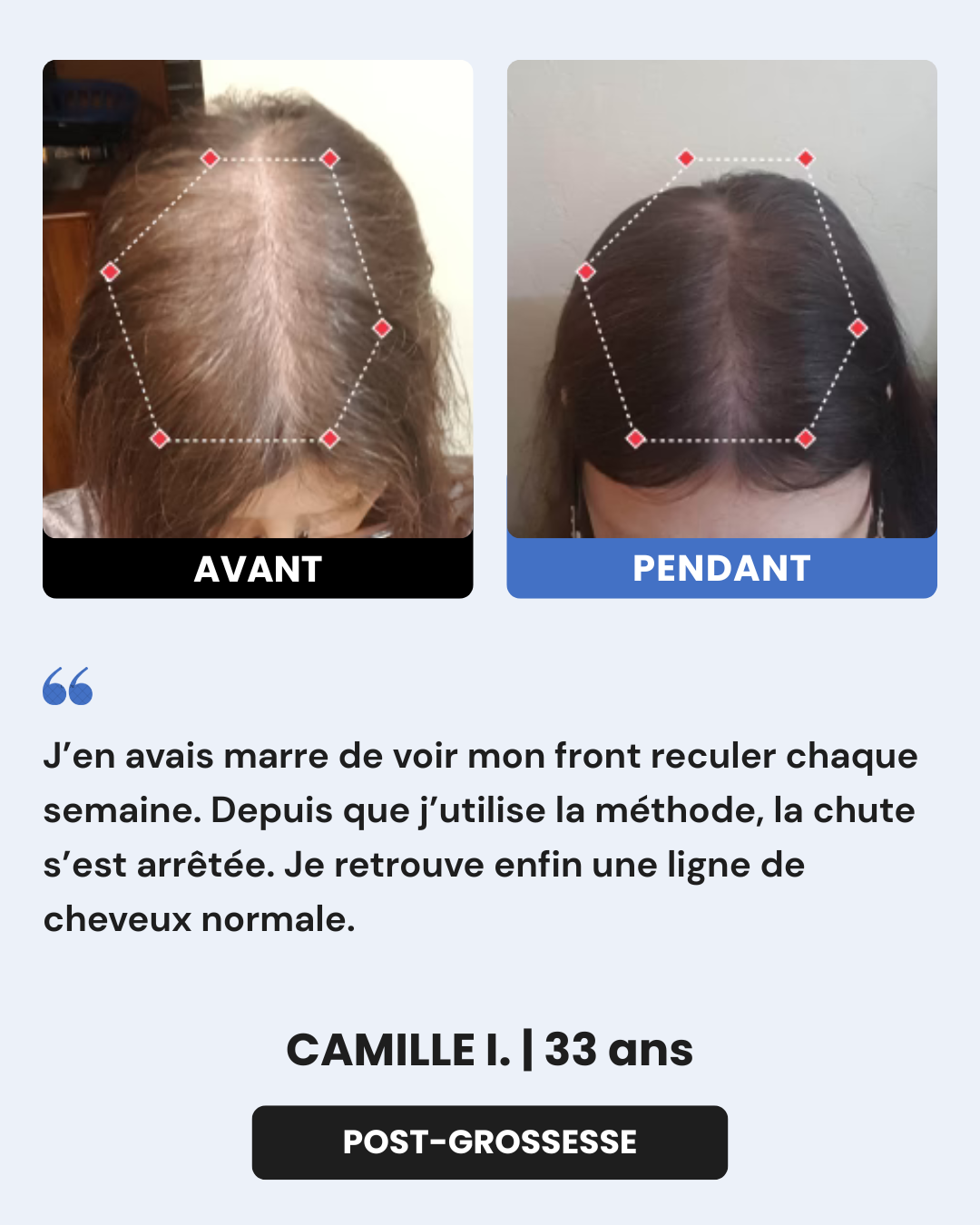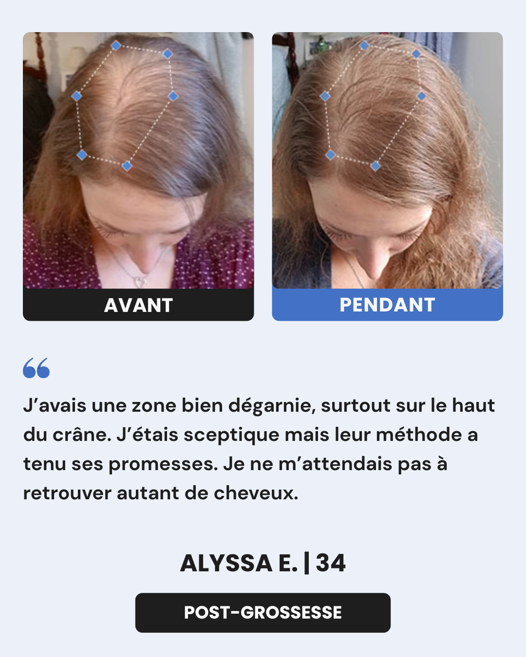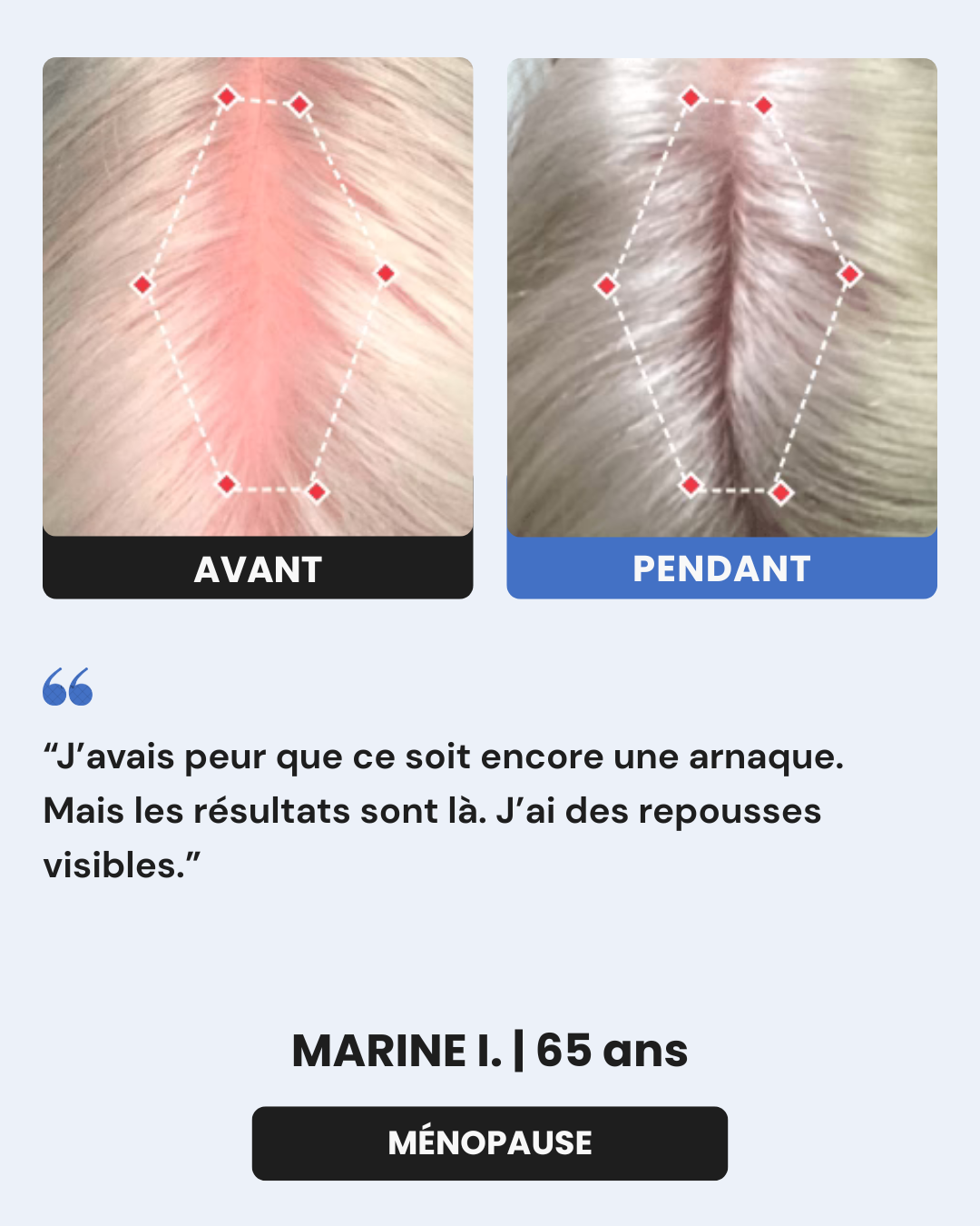 Consultation diagnostic préalable : nous refusons près de 20% des candidates que l’on va considérer non éligibles, cette consultation à aussi pour but de voir si notre solution est adaptable à vous. Pour les femmes éligibles : vous bénéficiez alors de notre garantie "Résultats ou Remboursé" 90 jours, mais aussi d’une garantie de 1 an sur le dispositif.Même si vous avez déjà tout essayé, cette technologie naturelle combinée à notre méthode a permis à plus de 10 000 femmes de voir une repousse visible dès 90 jours – même celles qui pensaient que « rien ne marcherait ».