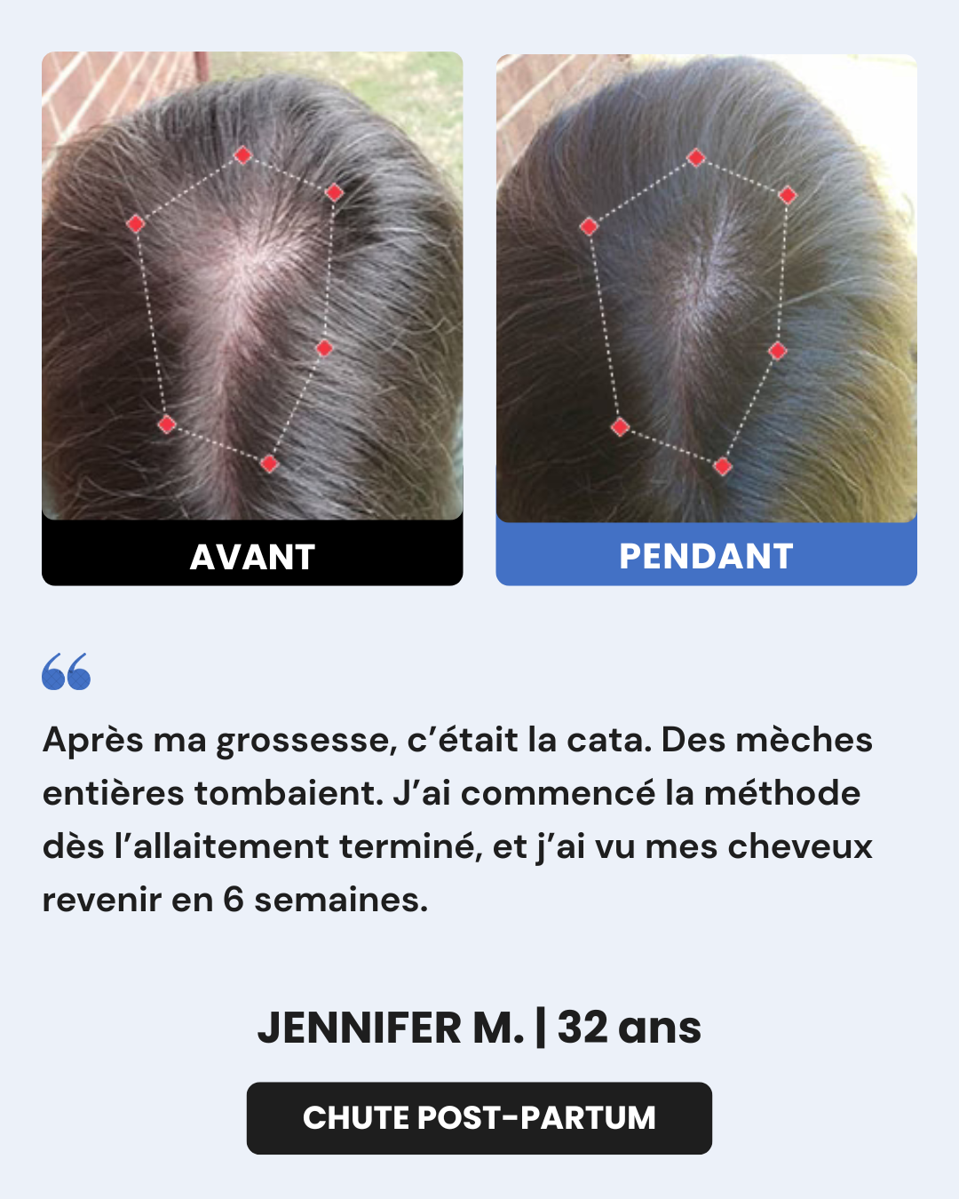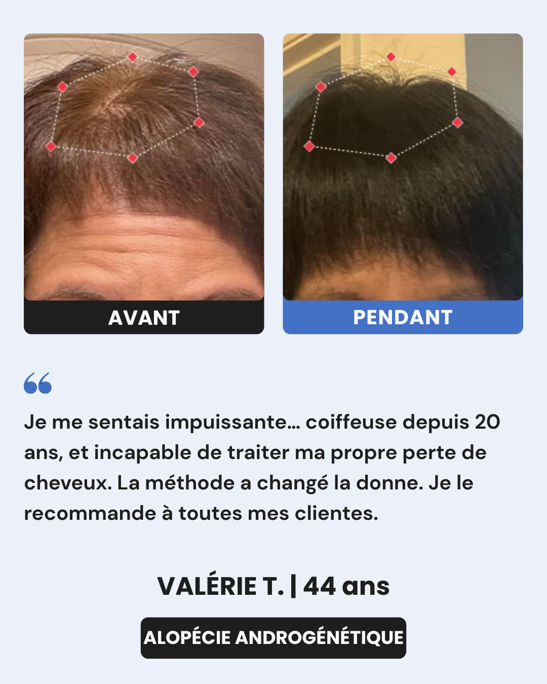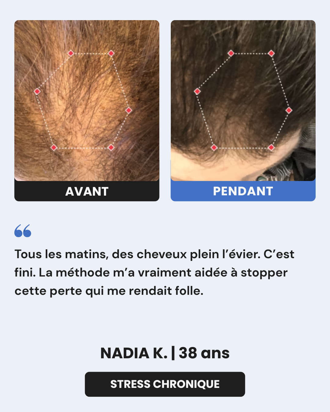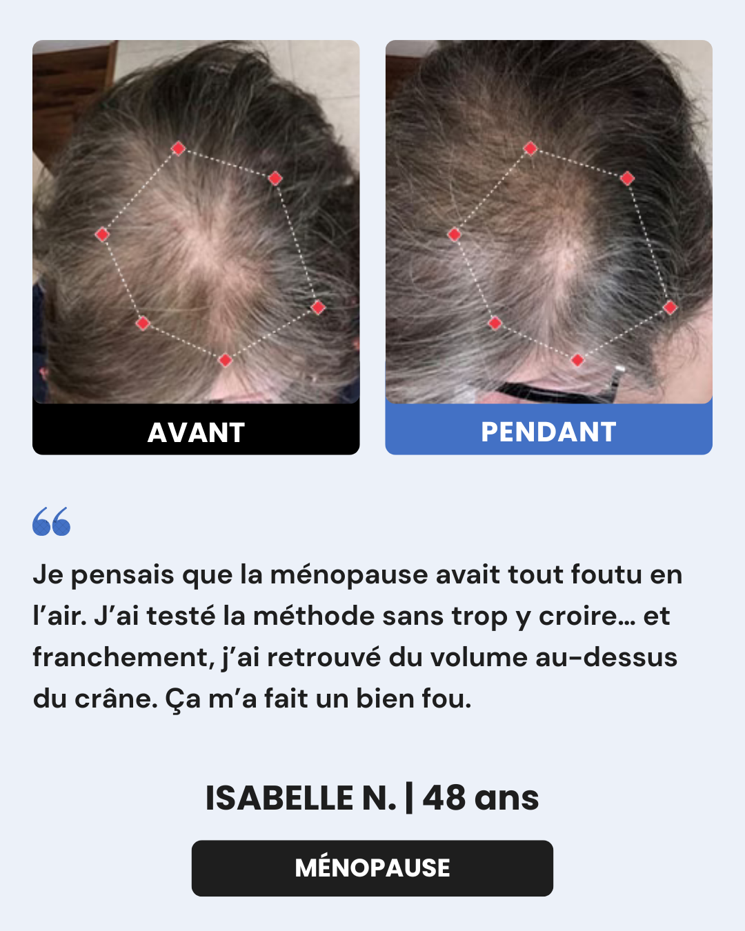 L'alopécie génétique crée une défaillance énergétique des follicules. Nous restaurons cette énergie cellulaire, permettant aux follicules de résister naturellement aux androgènes.Efficace même sous SOPK ou ménopause. 65% de nos clientes ont des antécédents familiaux.