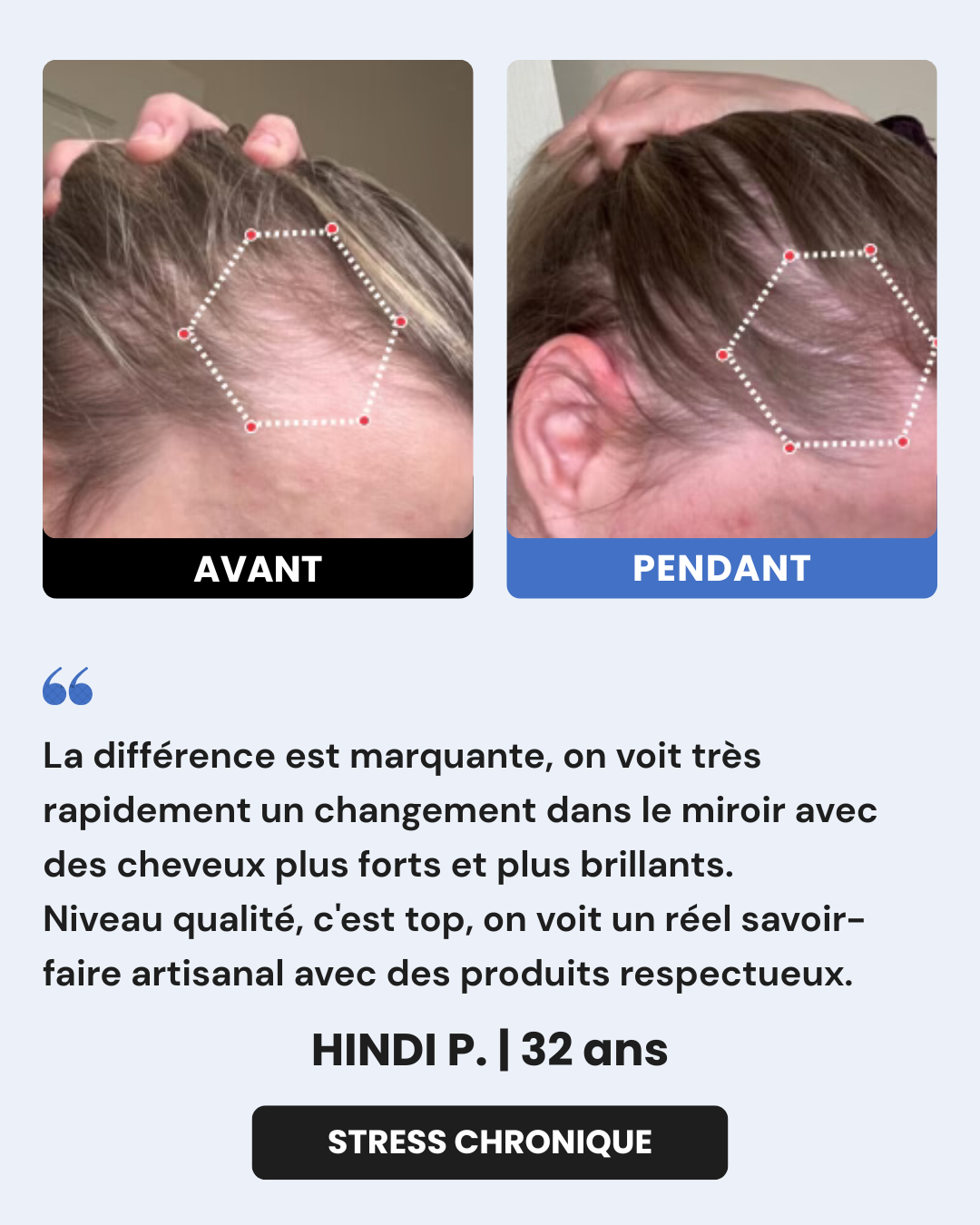 Des résultats sont visibles entre 45 et 90 jours (pousse de nouveaux cheveux, ralentissement de la chute…). Ensuite, la régularité est clé si l’on veut aller plus loin et obtenir d’excellents résultats. Évidemment, nous vous accompagnons à chaque étape pour optimiser au maximum ces résultats.