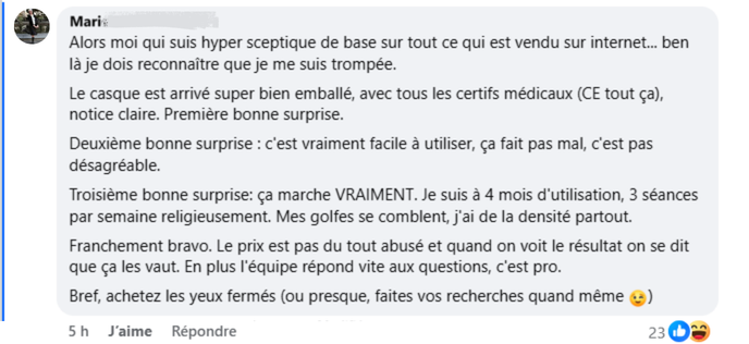 Étude coréenne 2025 sur 146 patients. Casque LLLT utilisé 20 minutes, 3 fois/semaine. Résultat : +25 cheveux/cm² après 48 semaines. 59% d'amélioration globale visible. Plus de 85% des patients satisfaits du traitement. Augmentation de l'épaisseur capillaire de 15%. Aucun effet secondaire rapporté.